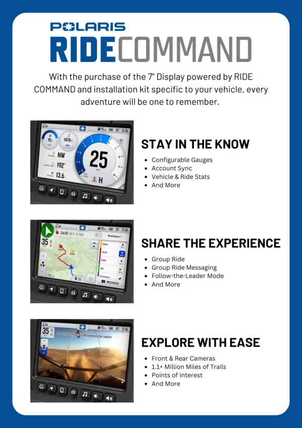 Változtasd át SPORTSMAN-edet a tökéletes kaland- és munkagéppé a RIDE COMMAND által működtetett 7 hüvelykes kijelzővel, amely zökkenőmentesen átalakítja a vezetőülést egy parancsnoki központtá, amely megbízható GPS navigációt és járműdiagnosztikát biztosít.