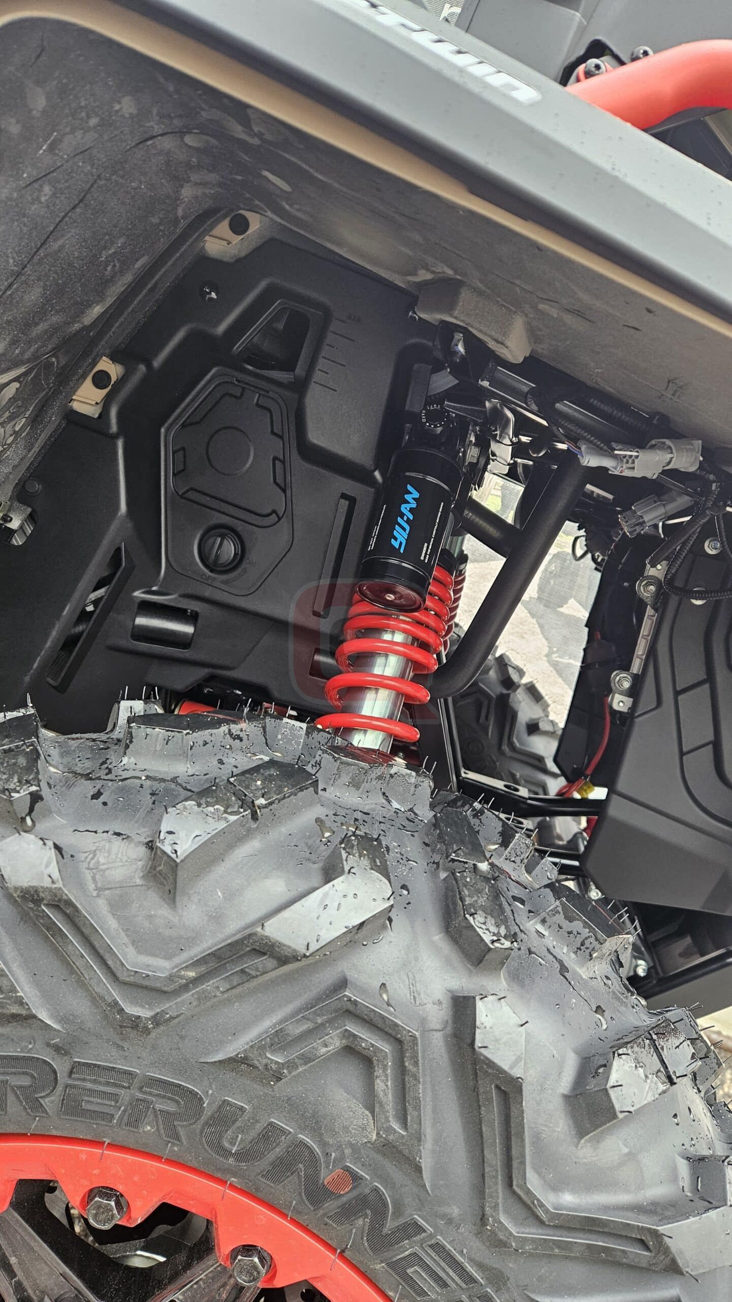14″-os Beadlock könnyűfém felnikkel, gáztartályos lengéscsillapítókkal. Az első-hátsó gallytörő, kézvédő csörlő az alapfelszereltség része.